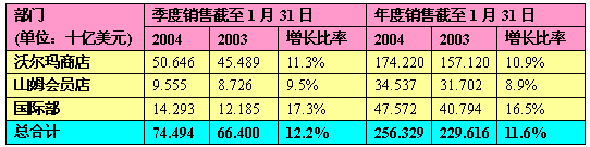 增长——2003年沃尔玛 根据沃尔玛公司最新的报告显示,该公司在截止到 1 月 31 日的第四财季中,销售额增长了 12 %,达 752 亿美元,去年同期则为 669 亿美元,利润提高了 8.4 %,达 27.2 亿美元,合每股 63 美分,上年同期则为25亿美元,即每股56美分。。利润额比去年同期的25.1亿美元有所提高,这一结果也超出了华尔街的证券经纪人们的普遍预期。其态度明显不同于公司前3个月,当时对于美国的消费支出的复苏力度曾经发出了警告。然而在沃尔玛首席执行官李•斯科特(Lee Scott)对第四季度财报的评论是:“与过去几年相比,我对刚刚开始的一年更乐观。我并非仅仅对经济……和住房市场的持续强劲感到乐观,也为沃尔玛的形势受到鼓舞。”随着全美消费性支出的上升,,沃尔玛也获得了极大的鼓舞。李•斯科特认为由于提高了退税额,并“最终将改善就业情况”,导致了美国消费支出因而受到了推动。作为全球销售额最大的零售商,沃尔玛的销售额占美国非汽车类零售额的8%,使它已经成为了全美消费者行为的晴雨表。 面对沃尔玛的上升势头,李.斯科特认为员工们的努力工作是公司成功的主要原因。 纵观2003年度(截至2004年1月31日),沃尔玛集团总销售为2586.81亿美元,利润为90.54亿美元,2002同期则为79.55亿美元,净利润率由3.46%上升为3.53%。其中,公司的营业收入2563.29亿美元,营业外收入23.52亿美元,销售成本1987.47亿美元,所占占销售额的比率由77.65%下降为 77.54%。公司2003年的国际市场销售收入表现强劲,在全部近270亿的销售额增加值中,有70亿来自海外。 李.斯科特表示,沃尔玛去年表现良好,但国际业务表现尤为优异。他强调说,尽管毛利率要好于预测,但业绩的改善要归功于商品的种类,而不是更高的价格。我们没有提价,也无意这么做。 营业收入情况: