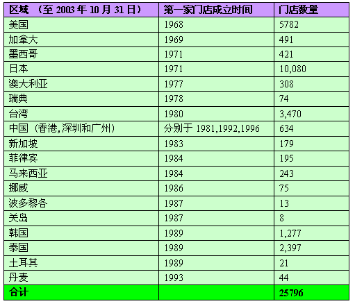 在过去的12个月,美国销售额上升了4.1个百分点,其中山姆会员店(SAM’S CLUB)上升5.3%,沃尔玛商店(Wal-Mart Stores)上升3.9 %。 沃尔玛商店(包括购物中心)在过去的一年中,沃尔玛商店销售利润129.16亿美元,比去年的118.40亿美元上升了9.1%个百分点。 山姆会员店在过去的一年中,山姆会员店销售利润11.26亿美元,比去年的10.23亿美元上升了10.1%个百分点。 国际部在过去的一年中,国际部销售利润23.70亿美元,比去年的19.98亿美元上升了18.6%个百分点。 截至2004年1月31日,公司拥有1478家沃尔玛商店,1471家购物广场,538家山姆会员店,以及在美国的64家社区店。在国际上,公司已经发展到阿根廷(11),巴西(25),加拿大(235),中国(34),德国(92),韩国(15),墨西哥(624),波多黎各(53),英国(267)。同时,沃尔玛还拥有36%的日本西友百货公司的股份,至2007年12月可以购买西友69.4 %的股份。西友百货公司在日本本土拥有超过400家门店。 沃尔玛公司同时在纽约和太平洋证券交易所以WMT标识挂牌上市,详细的股票价格信息可以随时查询。 总结: 本年度沃尔玛的官司缠身,一系列关于非法劳工事件的爆出,使得世界第一大零售企业经常以一种反面的形象出现在观众眼前。众所周知,沃尔玛在对于用工和供应商选择上有着非常明确和系统化的考评标准,竟然也频繁出现这种负面报道,不知到底是何缘故? 而同时,沃尔玛在2003年2月也制造了一次零售行业大地震,它宣布把美国最大的批发配送商McLane卖给位于内布拉斯奥马哈(Omaha)市的Berkshire Hathaway。这一行动引起行业的巨大震惊,同时更搅乱了便利店已经乌云密布的批发配送系统。 McLane之前是Wal-Mart的子公司,负责配送食品及一般商品至便利店、药妆店、大卖场、批发店、快餐店和电影院,2002年度会计年度的营业额为220亿美元,这项合并售出案(Wal-Mart另售出Merit Distribution Services给Switf Transportation Co.)一共为Wal-Mart赚进15亿美元。Wal-Mart的总裁兼执行长李.斯科特说:“这笔交易对Wal-Mart和McLane都有好处,Wal-Mart可以更专注于核心的零售事业,而McLane则将有更多商机。” 沃尔玛在1990年对McLane公司的购买是McLane的前任总裁和沃尔玛的创始人山姆.沃尔顿经过长期、复杂的相互作用后达到的一个顶点。McLane说他将公司卖给沃尔玛的初衷是因为他确信沃尔玛建立大型超级中心和其杂货商店会成为胜利者。 根据华尔街日报报导,Berkshire Hathaway的董事长兼执行长Warren Buffett(沃伦巴菲特)于年度股东大会上谈论McLane采购案时告诉股东,约一周前沃尔玛的一位主管前来向他洽谈出售McLane事宜,这件交易在一两个小时内就敲定了。他并未多说其它细节,只说:“Wal-Mart知道我们会是个好东家。” McLane如今已经服务于所有的Major Oils商店,并与几个最大的便利商店连锁签定了供货合同,包括7-11公司的超过5300家的商店和Sunoco有限公司的超过830家商店。现在McLane与沃尔玛公司已经没有任何关系了,也许会有更多的便利商店零售商选择McLane做为他们的供货商。 沃尔玛是一个老笑话的活生生的例子:重达800磅的大猩猩睡在什么地方呢?答案是任何它想睡的地方。但是如果800磅重的猩猩放开你,会发生什么呢?这就是许多人认为的McLane公司的处境…… 加盟——2003年7-Eleven 综述: 2004年1月,在世界最大的连锁便利店企业7-11的总部,美国达拉斯市公布了其2003年的经营情况。截至2003年底,7-11在美国和加拿大拥有门店5800多家,同时特许授权了大约20000家门店在包括美国本土以外的17个国家和地区(墨西哥,中国,夏威夷,台湾,日本,泰国,新加坡,丹麦,关岛,波多黎各,韩国,土耳其,韩国,澳大利亚,瑞典,挪威,马来西亚,菲律宾)。2003年,全球的7-11门店的销售额超过了360亿美元。7-Eleven公司在2003年销售增长 10.1%,取得109亿美元的销售。 2003年7-11门店分部:
