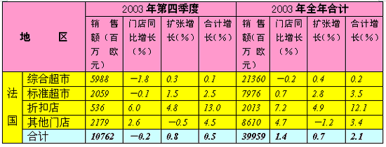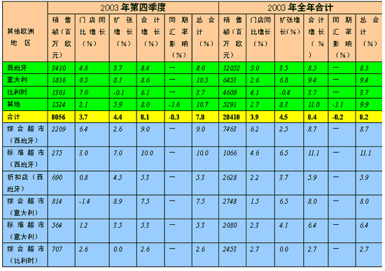 2003年度,家乐福集团在欧洲其他地区的销售完成情况非常好,同比销售增长达到了3.9%,新增门店销售增长4.5%,全年销售增长高达8.2%,是集团销售增长最快的所有地区。其中表现出色的有: 西班牙的大型综合超市全年都继续保持高速的增长,第四季度同比销售增长达到了6.4%(仅次于第二季度同比增长7.9%)。西班牙大型综合超市全年同比增长6.2%,大大高过了新店扩张所所带来的2.5%的比率。同时,西班牙的标准超市业态全年的门店扩张速度和同比销售增长都获得了比较高的增长,全年销售增长超过了两位数。 另外由于意大利高速的门店扩张,全年销售额增长9.4%,成为该地区发展快速的国家。 虽然,整个拉美地区的销售增长仍然没有摆脱负增长,但因为汇率的负面影响正在逐步减弱,全年的销售增长率为-11.9%。这与2002年相比,已经有比较大的增长,在2002年仅仅汇率一项,就将该地区的全年销售增长拉低了39.30%,2002年的全年增长竟然是-26.5%. 在2003年的拉美市场,家乐福集团的的发展模式逐步适应了当地的购买力水平的增长,其中在部分地区,例如阿根廷,在第四季度的同比销售增长达到了8.3% ,同时该国的大型综合超市的同比增长达到了18.5%,这些都是值得高兴的事情。