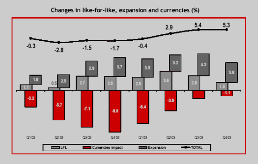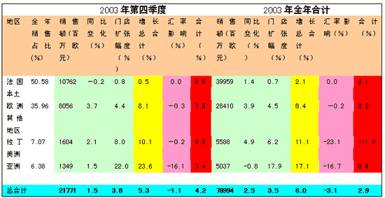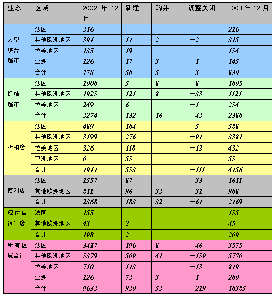 好运——2003年家乐福 ·2003年,家乐福集团全年销售增长含税当未折算汇率增长达到了6%。在当前汇率折算情况下,销售增长2.9%,销售额达到789.94亿欧元。 ·这个增长情况是在我们的预期以内的,在最后的一个季度,不管法国的经济环境多么困难,家乐福还是圆满完成了任务。然而在中国有8家大型综合超市原本预计会在本季度末开业,将推迟到2004年第一季度开业。 ·尽管如此,整个集团还是在按照计划的发展扩展。在2003年度,集团新开辟销售网点920个,超过了计划的830~900的销售点的目标,如果包括终止的和正在调整的门店,家乐福目前已经拥有了10,385 家门店。 ·这个销售增长情况确保了家乐福集团在2003年的每股收益(EPS)的增长和目标都达到了两位数的增长。 综述: