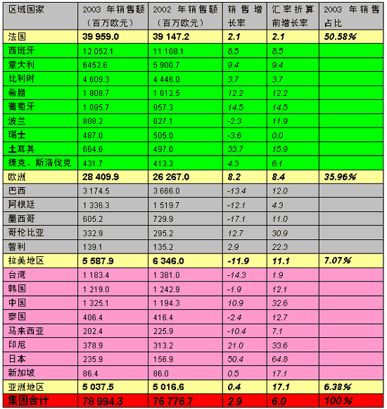 从2003年各个地区的发展情况来看,在固定汇率下,亚洲和拉丁美洲的增长最为迅猛,都超过了两位数增长,分别达到17.1%和11.1%。但是由于欧元汇率在2003年的不断攀升,全年因为汇率影响也都超过了两位数以上,尤其是拉美地区达到23.1%,进而导致年终拉美地区的销售不及去年。 2002~2003年销售总比情况