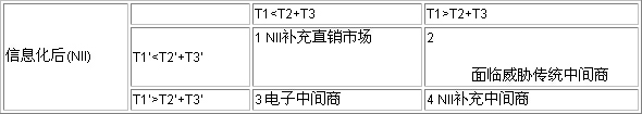 信息技术发展促进新型网络化信息化市场建立,作为市场中介的中间商面临严重挑战,在信息化浪潮中不断演变。在基于交易成本理论分析框架下,分析了传统中间商的存在前提和发展趋势,同时讨论新型网络化信息化中间商将代替部分传统交易成本较高的中间商。 四、信息化后中间商演变 现实情况是,信息技术的发展既促进了中间商信息化和提高效率,同时出现了许多新的不同类型中间商,并没有抑制中间商的发展。为具体分析中间商存在前提和依据,不妨简单的假设市场交易主体有三类,即生产者(P)、消费者( C)和中间商(I);销售渠道有两条,即从生产者到消费者的直接交易,其交易费用定义为T1;另外一条是通过中间商与消费者进行间接交易,把生产者与中间商的交易费用定义为T2,中间商与消费者的交易费用定义为T3。显然,中间商存在的前提原因是T1>T2+T3,因为生产者在追求利润最大化时愿意选择费用较低直销交易方式和渠道。为对比分析实施NII后中间商存在依据和前提,这里不妨将信息化后的三种不同交易费用对应定义为T1’、T2’和T3’。 信息化前(无NII)