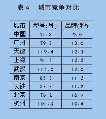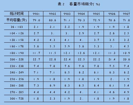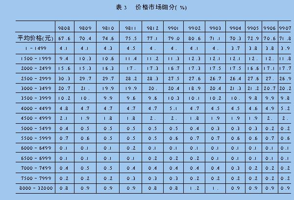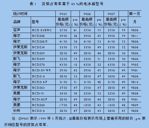 分析结果 (1)电冰箱市场容量 商场经销电冰箱的型号数量由1999年1月和2月的平均79种下降到70种上下,并随后保持稳定直到本分析截至的7月份。每个商场基本上有9个品牌入店,市场上多出一半的电冰箱(52.1%)分属四大领先品牌;前9位的品牌占据了80%的市场。 (2)市场重要型号 厂商所推出的型号应该是消费者所倾向购买的型号,也同时是极力向商家推荐的型号;同时商家直接面向消费者,会根据销售情况而向厂商订购销路好的型号,所以相互作用的结果会呈现在货架之上。从表1货架占有率高于45%的型号列表中可以分析,货架占有率排名在第一至第十位的型号,从而得出目前畅销的产品多为一年以前推出的200升以上的电冰箱。 在整体市场上,海尔和伊莱克斯为主要竞争参与方,而且因为双方具有相似的电冰箱产品系列,所以两品牌之间的竞争应该是非常激烈的。 (3) 电冰箱的容量 下面的数据为电冰箱按容量的细分 市 场(见表2容量市场细分),可以发现消费者 首选的容量位于200升至228升,1999年7月商场的平均陈列型号数为71.8种,其中属于200升至228升的型号占据了20.6%;也有相当的消费者选择容量稍小的180升至190升的电冰箱。而且通过进一步的区域分析发现全国各地市场基本具有这种消费倾向。 (4)电冰箱的价格 分析近 来 12个月的电冰箱价格变化趋势会发现整体市场价格有略微下滑,这同国内消费滞缓有关(见表3价格市场细分)。厂商推出低价的型号或降价,企图刺激消费,其中 2500元至3000元的供给有所下降,所空出的市场空间由2000元至2500元和1500元至2000元的产品所填补。消费者的购买预算在2500元到3000元占26.9%,3000元到3500元的占20.2%,2000元到2500元的占17.7%。 (5)地区差异 一个地区的竞争激烈程度可以由当地商场平均陈列型号数和平均陈列品牌数衡量,在IFR监测的32个城市中,排列在前五位的城市为广州、天津、上海、武汉、南京和长沙。在这些城市中,参与竞争的品牌均超出了全国平均9个品牌的水平,见表4数据。 家用电器科技 武建光 |