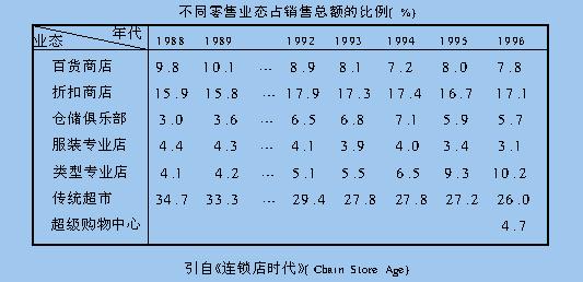 笔者认为,零售企业要在不断变化的市场环境中赢得属于自己的市场份额,必须不断调整经营战略,其中包括业态调整和重新选择业态。本文选取近几年美国的几种综合类连锁业态,重点描述其特点和发展过程,对它们的销售额变化进行分析比较,并结合我国零售市场,提出对业态选择的看法 零售企业要在不断变化的市场环境中赢得属于自己的市场份额,必须不断调整经营战略,其中包括业态调整和重新选择业态。国外大型零售企业往往不局限于一种零售业态。每种业态除保持一定的特点外,在商品组成及营销策略等方面并非一成不变。我国企业要在激烈的市场竞争中求得发展,有必要研究国外零售企业的不同业态特点及其发展过程,这对中国企业建立适合国情的、满足本国消费者需求的零售业态会有一定的借鉴。本文选取近几年美国的几种综合类连锁业态,重点描述其特点和发展过程,对它们的销售额变化进行分析比较,并结合我国零售市场,提出对业态选择的看法。 一、零售业态种类、特点及销售趋势 1、百货商店(Department stores)。(1)百货店是一种相对古老的零售业态,单店面积10000~20000平方米,它经营的商品种类较广,每类商品中也有较多的品牌、规格、花色等。随着市场经济的发展,美国的传统百货店都大大削减了原有的商品部,而集中在服装、服饰等软性商品上。(2)百货店对顾客提供的服务是独一无二的。因此,它的人工成本较高,商品价格也较贵。(3)进入80年代以来,由于折扣店和专业店的竞争,加之百货店的服务质量下降,所有百货店的销售要么停滞不前,要么增长极微。为此,百货店努力改变商品的搭配和展示,还致力于开发自有品牌。它们针对特定的消费群体、特定的连锁分店或特定的搭配设计师组织进货,要求进货员从过去的商品导向变成市场导向。(4)80年代后期至90年代,美国百货店的增长极为缓慢,扣除物价因素实际的年均销售额增长普遍为1%~2%(这一时期美国通货膨胀率平均约为4%)。 2、扣商店(Discount Stores)。(1)折扣店提供广泛的商品种类、有限的服务和较低的商品价格,它的定位取向是中低收入消费者。它之所以能采取低价格主要由于:顾客采取自助服务方式;商店租金(地价)较便宜。(2)折扣店和百货店经营商品总数量相当,但在品牌、规格、花色上比百货店要少。单店面积8000平方米左右。一些商品,如五金工具、汽车配件、体育器械和园艺设备等是百货店不经营的。(3)折扣店连锁在80年代末和90年代初增长较快,1988~1996年间沃尔玛(Wal-Mart)和塔吉特(Talget)的年均销售增长分别达到16.1%和13.8%,其中1988~1993年间,沃尔玛折扣店年销售增长都在20%以上,而1994年后,由于类型专业店和超级购物中心等新业态出现,使折扣店增长趋缓。 3、专业店(Speciality Stores)。(1)传统专业店经营的商品集中在有限几种互为补充的品种上,并提供高水平的售货服务,商品价格较高。其单店面积一般在1000平方米以下。专业店的市场定位瞄准的是一个很窄的细分区间,目标针对中高收入阶层,其商品种类比百货店和折扣店都少,但品牌、规格、花色等较多,这使购买该类商品的消费者有更广泛的挑选余地和更好的购物体验。(2)80年代末和90年代初专业店的发展不太平衡,经营较好的专业店能一直获得稳定的增长,如盖浦商店(The Cap)和有限商店(The Limited),1988~1996年销售年均增长分别为19.7%和9.9%。他们的成功在于他们根据市场变化,树立自己的经营特色,盖浦商店大力发展自有品牌,“盖浦”时装、童装深受消费者喜爱;有限商店针对不同消费群体,建立不同店面风格和商品类别的连锁分店。 4、类型专业店(Category Specialist)。(1)类型专业店提供的商品的特点是少品种,多规格,多档次,多花色。以顾客自选为主,适当提供帮助,采取低价格策略。其单店面积在5000~10000平方米。(2)类型专业店的低价格策略,源于它使用了先进的库存管理系统和配送系统,其商场位置和内外装修等也以简易实用为主。又由于能以低价格提供某类商品几乎全部品牌、款式、规格、花色,这使其他零售商在经营该类商品时处境艰难,也常被称为“类型杀手” (Category Killers)。例如,R玩具商店(Toys“R”US)在玩具和娱乐用品上占据了美国40%的销量,能利用采购量大的威力,获得低进价和紧俏的品牌,这使得与该店毗邻的百货店和折扣店都削减或取消了玩具和娱乐品的经营数量。 5、仓储俱乐部(Wholesale Clubs)。(1)仓储俱乐部的商品构成中一半为食品,一半为其他商品,商品种类较多,但品牌、规格、花色少。这是为了降低库存费用只经营畅销的品牌,它一般在制造商做促销时才购进商品,自己不做广告。(2)仓储俱乐部在低租金地区独立选址,单店面积达8000~10000平方米,内部极俭朴,几乎不提供任何服务,顾客购货数量较大,以上特点决定了仓储俱乐部商品的低价格。大多数仓储俱乐部有两种会员制,一种是小型零售商或消费团体,另一种是个人消费者。(3)仓储俱乐部在90年代竞争异常激烈,现在,美国仓储俱乐部销售基本由两家垄断。沃尔玛的萨姆俱乐部90年代的销售额年均递增15%左右;克斯科俱乐部90年代销售额年均递增30%左右。 6、超级购物中心(Supermarket)。(1)超级购物中心是经营食品和其它日用商品且兼营各种服务的零售业态。这一概念早在几十年前就存在,近年由沃尔玛对其进行了发展,获得了前所未有的成功。沃尔玛的超