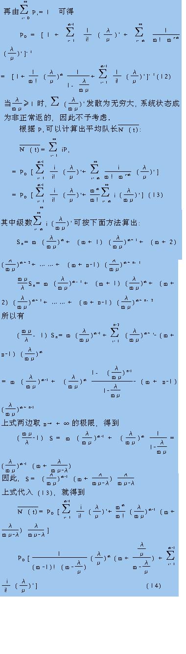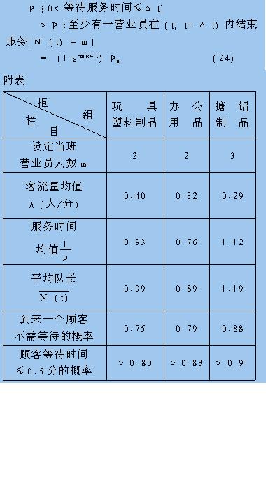 在已经测得平均客流量和平均服务时间的条件下,如何科学合理地确定营业员人数,并核定营业员的工作量和劳动报酬,便成为当前商业零售企业管理中迫切需要解决的问题,本文介绍了一个解决问题的数学方法 商业零售企业不同柜组之间由于客流量和服务时间的差异,各柜组所需营业员人数是不同的。营业员人数过少,顾客等待时间就长,会影响服务质量;营业员人数过多,则会造成人力资源的浪费,影响劳动效率。在已经测得平均客流量和平均服务时间的条件下,如何科学合理地确定营业员人数,并核定营业员的工作量和劳动报酬,便成为当前商业零售企业管理中迫切需要解决的问题。 设商业零售企业各服务系统(柜组)有m个营业员,当有顾客到来时,如有营业员空着,空着的营业员立即来服务,否则等着,直到有一个营业员接待完一个顾客后再来接待,顾客按先到先接受服务的原则进行排队,以N(t)表示时刻t正在接受和等待服务的顾客人数(顾客队伍长度,简称队长),当N(t)=i时,称“时刻t系统处于状态i”。 设一顾客已接受服务时间t,再接受服务时间△t与t无关,服务时间服从指数分布: P{ξ≤t+△t|ξ>t}=1-P{ξ>t+△t|ξ>t} =1-P{ξ>t+△t|ξ>t}/P{ξ>t} =1-P{ξ>t+△t}/P{ξ>t} 商业零售企业不同柜组之间由于客流量和服务时间的差异,各柜组所需营业员人数是不同的。营业员人数过少,顾客等待时间就长,会影响服务质量;营业员人数过多,则会造成人力资源的浪费,影响劳动效率。在已经测得平均额流量和平均服务时间的条件下,如何科学合理地确定营业员人数,并核定营业员的工作量和劳动报酬,便成为当前商业零售企业管理中迫切需要解决的问题。 对于客流量,“潜在”的顾客数远远大于已到来的顾客数,不管已接待了多少个顾客,“潜在”的顾客数几乎总量不变,顾客的到来与服务情况无关。 因此,当已知时刻t系统所处状态i(即已知N(t)=i),则在时刻t+△t(△t>0)时系统状态与时刻t之前的任一时刻系统状态无关,所以{N(t),t≥0}是一个马尔可夫过程,实际上,它是齐次可数的。 现设时刻t正在接受服务的顾客为k(k≤m),那么由(1)式,在(t,t+△t)内恰有s个顾客结束服务的概率为: 至于客流量,有如下分析: 以Pij表示系统状态由i变为j的条件转移概率,即Pij=P{N(t+△t)=j|N(t)=i} Pi为无条件概率,即 Pi=P{N(t)=i},由于 {系统状态不变}={没有顾客结束服务,也没有顾客到来}∪{恰有一个顾客结束服务,恰有一个顾客到来}∪{有两个或两个以上的顾客结束服务,有相同数量的顾客到来} 上式第3个事件的概率,根据(3)、(6)式,应为o(△t),因此,由(3),(4),(5)式可得到 P{系统状态不变}=Pii(△t) =[1—iμ△t+o(△t)][1—λ△t+o(△t)]+[iμ△t+o(△t)] [λ△t+o(△t)]+o(△t) =1—(iμ+λ)△t+o(△t)(7—1)(i≤m) 当i>m,则有Pij(△t)=1(mμ+λ)△t+o(△t)(7—2) 类似地,容易得到