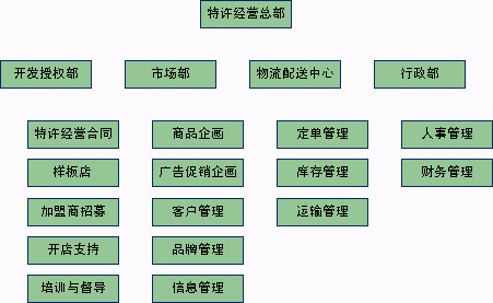 组织架构的完善程度决定了整个特许经营体系的实施力量。组织架构通常由整体架构和总部架构两部分内容。