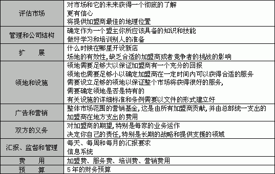 五、实操步骤二:特许经营计划 3、特许体系成长路线 特许体系象人一样,也有一个逐步成长的过程。 4、特许经营业务计划 业务计划是特许经营的“基本法”,是操作的宪章和纲领。业务计划的内容包括: 以下是业务计划书的模板: 特许经营业务计划书大纲 I. 封面 A. 特许人公司总部的名称和地址 B. 你的姓名、地址和电话号码 C. 计划日期 II. 执行概要 III. 目录 IV. 第一部分:企业 A. 特许经营描述 B. 产品/服务 C. 市场 D. 特许经营场所 E. 竞争 F. 管理 G. 职员 H. 合同义务 V. 第二部分:财务数据 A. 资金来源和应用 B. 设备列表 C. 租赁物改良 D. 供应品的来源 E. 额外特许经营义务 F. 损益计划(损益表) 1. 三年汇总 2. 第一年的月明细 3. 第二年和第三年的季明细 4. 注释说明 G. 现金流量计划 1. 第一年的月明细 2. 第二年和第三年的季明细 3. 注释说明 H. 盈亏平衡分析(如果适用的话) I. 现有受许人的历史财务报表或转变 1. 前三年的资产负债表 2. 前三年的损益表 3. 纳税申报单 VI. 第三部分:支持文件(特许经营合同、个人简历、个人财务报表、证明信、租约副本、供应商合同和其它与计划相关的文件) 作者:刘威(knewway),EMBA,资深战略规划与品牌营销顾问,现为整合策略咨询机构首席咨询总监,为多家知名企业提供过突破性战略、低成本营销、超增长品牌等方面的策略规划和实施辅导咨询服务 |