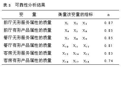 4.2模型二 在上述分析中,我们发现:在衡量各个部门服务质量的指标中,无形成分指标的因子载荷比有形成分指标的因子载荷高得多,表明两类属性的质量对宾客的满意程度可能有不同的影响。因此,在模型二中,我们分析两类属性对宾客对各个部门的满意程度的影响。模型二比模型一复杂。三个部门的服务质量均划分为有形产品成分质量和无形服务成分质量。表3中,各个计量尺度的a>0.74,表明数据依然很可靠。