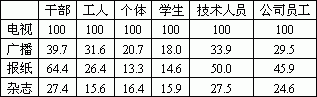 干部、公司职员、技术人员每天接触三种传媒的比重较高,且对报纸的接触程度尤为突出,干部每天接触报纸在1小时以上的比重高达64.4%,技术人员和公司员工分别为50.0%和45.9%。