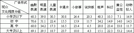 (二) 20岁以下观众对明星表演、儿童表演、卡通片等广告形式喜爱程度高于其它年龄者。