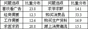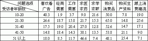 主要表现为年龄大的受众主动接触广告的原因为求医求药的比重高于年龄小的受众,而年龄小的受众主动接触广告的原因为求职求学、跟上消费潮流、购买消费品和喜欢看广告的比重高于年龄大的受访者。