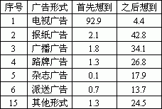 可见在广告受众印象中,电视广告占首要位置,并且电视广告、报纸广告、广播广告、路牌广告、杂志广告、派送广告等六种广告形式为广告受众心目中的主要广告形式。