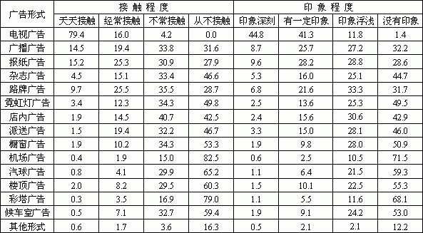 对于不同广告形式的广告受众的接触频次和印象程度也会有所不同,调查结果显示按受众接触程度排序前几位依次为电视、报纸、路牌、广播、派送、杂志等。其中天天接触或经常接触的受众比重分别为电视广告95.4%、报纸广告40.5%、路牌广告35.2%、广播广告33.9%、派送广告20.9%、杂志广告19.6%。受众印象最深的广告形式依然为电视广告,印象深刻者达44.8%,报纸广告、广播广告、路牌广告、杂志广告、派送广告、店内广告、霓虹灯广告等印象深刻者均在10%以下。