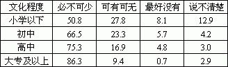 表1.4.1 不同文化程度受众对广告作用的看法分布