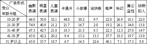 对于不同年龄的受众来说,年龄在10-20岁的受众喜欢的广告形式特点比较突出,与其它年龄段的受众相比,他们更喜欢儿童表演、卡通片、小故事、科幻和动物拟人类的广告形式。而对于明星表演、卡通片、科幻这几种广告形式而言,随着年龄的增加喜欢的比重呈下降趋势。年龄大的受众对相声和快板的广告形式喜欢的比重相对更大一些。年龄在21-30岁受众对公益性的广告更为重视。
