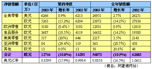 2004年1月9日,世界第三大零售商荷兰阿霍德(Ahold)公布了2003年的销售情况,公司全年销售额下降了10.5%,全年年销售560.73亿欧元,合715亿美元(美元与欧元的汇率情况由2002年的1.061下跌为0.8858),2002年则为626.83亿欧元。2003年阿霍德超过70%销售业务来自于美国,由于美元对欧元汇率的贬值,造成了以欧元统计的销售的下降。如果排除汇率因素,2003年销售额实际上升了2.7%。在2003年第四季度,公司销售127.4亿欧元,比2002年同时期的销售额(142.9)下滑了10.8%,同期美元与欧元的汇率由0.9984下降为0.8399,下跌幅度达到15.9%,销售如果扣除汇率影响销售额上升了0.7%。 下图为公司销售统计情况: