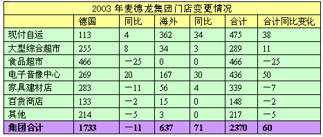 同时,公司合并了其在美国的两大食品连锁超市Giant和Stop & Stop,成立一个新的单一的零售公司,将集中精力于旗下其余的在美国的食品零售业务,包括Stop & Shop,Giant-Landover,Giant-Carlisleand Peapod,让这些子公司重回增长之路。 希望阿霍德在新的一年里能够通过这一系列的战略有所收获,避免破产的厄运的到来。 记得定位学的大师特劳特先生就曾经接手过阿霍德的下属公司StopP&Shop超市为其寻求门店定位的案例,当时所设立的方案时将“价格透明化”的特点植入消费者心智。Stop&Shop所有的传播上都讲这样一个故事:“我们的差异并不体现在货架上面,而是体现在货架后面。”这句话也许恰恰反映了零售企业的一些本质,如何在表面的无差异竞争下,获取背后的利润,这才是一个零售企业的发展之路,当然,背后的利润不是造假出来的…… 达标——2003年麦德龙 2004年1月,麦德龙集团宣布公司全面完成2003年度的销售目标。固定汇率下,集团在2003年销售额在上升了5.7%,扣除汇率的影响,销售额上升了4.0%,达到536亿欧元(2002年销售515亿欧元)。在固定汇率下,公司第四季度销售额上升了5.4%,扣除汇率的影响,仍然上升了3.6%。虽然,在第四季度,德国的圣诞节经济如同预期一样,没有太大的销售增长,但是在世界的其他地区,销售增长依然强劲。 麦德龙集团依靠国际化不断发展,Metro Cash & Carry and Media Markt / Saturn 新开店面91家。集团股票每股收益上升6-10%。 麦德龙集团超市销售额上升了4.3%,达到了533亿欧元,扣除汇率影响外,区域的销售增长达到了6.0%。在海外市场,集团销售增长达到了10%以上,其中包括汇率所带来影响的+6.1%的影响,依托于欧洲市场的强劲增长,海外的销售份额由46.3%上升为47.2%。 麦德龙集团CEO Dr. Hans-Joachim宣布:“集团以5.7%的销售增长完成了2003年度的销售目标。我们对于集团第四季度的运作发展表示满意。我们的国际商业发展势头依然强劲。正如我们的预测,德国本土的圣诞经济缺乏动力。我们维持了集团每股收益的目标,也是基于海外良好的发展才完成了6~10%的增长业绩。” 在第四季度,麦德龙(Metro Cash & Carry)会员店新开门店20家,其中德国,法国,英国,意大利,印度各开了2家,罗马尼亚由4家门店,西班牙3家,俄罗斯,比利时,克罗地亚各开了1家门店。