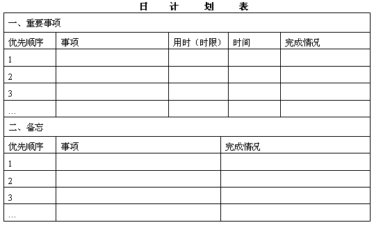 ![]() 日计划是所有计划工作的细胞,日计划工作的缺失和低质量,势必导致整个时间管理和计划管理的质量达不到效果。值得注意的是,表中重要事项设定时一定要按80/20原则,采用最有价值的事情优先的原则。同时在计划时间时你只能计划工作时间的60%,预留40%的时间不计划,这40%的时间用于处理那些不可预知的事情。