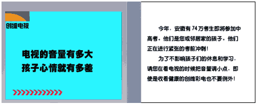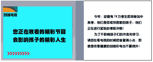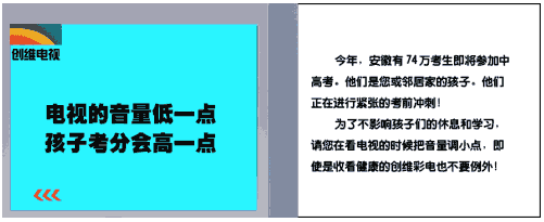 核心文案:今年,安徽有74万考生即将参加中高考。他们是您或邻居家的孩子。他们正在进行紧张的考前冲刺!为了不影响孩子们的休息和学习,请您在看电视的时候把音量调小点,即使是收看健康的创维彩电也不要例外!