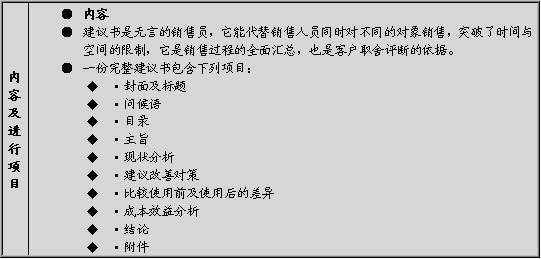建议书是无言的销售人员,它能代替销售人员同时对不同的对象销售,突破了时间与空间的限制;它是销售过程的全面汇总,也是客户取舍评断的依据。