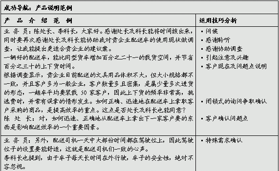 产品说明是您发挥高度销售技巧的场合,希望您能争取更多的机会锻炼您的技巧与胆识,唯有更多的练习,您才更有说服力。