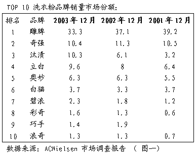 盛及必衰,这是个定律。只是中国的企业的从兴到衰时间实在是太短。纳爱斯可能现在还没到衰败的田地,但倒退的脚印已清晰可见。 成功,措手不及 纳爱斯从重新进入洗衣粉行业到获得该行业第一名仅仅用了2年时间。2001年它的销量达到89万吨,相当于所有在华跨国公司洗衣粉总量的5倍,超过国内前10家的总和。拿都是低附加值、高运送成本的啤酒比较,2001年的第一名三得利的市场份额不过在10%左右,辐射地区也仅仅是上海及其周边地区。但是雕牌的市场份额却高达40%,权重分销更是达到95%。后者意味着它进入了31个省份,2300多个县,450万间商店,真可谓“有水处,必有雕牌”。