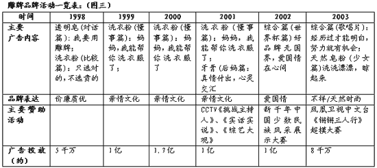行内人士都知道,雕牌每卖出去1吨洗衣粉内就有400公斤南风集团的元明粉。而南风集团的奇强洗衣粉却正是雕牌最大的竞争对手。所以对比雕牌,奇强更有成本的优势。而事实上南风集团已经在在西北、东北、东南、西南等地农村市场分别推出金猫、洁力王、佳宝、太阳等价格更低的区域性品牌洗衣粉来对抗雕牌。同时跨国公司在这个品类上也终于惊醒,“低价意味着销量”。所以节约成本成了经营该品类的头等大事,从把外籍经理“赶”回老家,到帮别人生产,请别人生产,所有的一切以节约成本为中心。无论是当年奥妙的“价格跳水”,还是汰渍的“强档价”,市场结果也验证了“低价是硬道理”。 从靠价格战起家,到“我们不打价格战”,只有一个理由,成本开始失去优势。其实从纳爱斯逐年减少的广告费上已经可以看到,它在成本和出厂价间可以运作的空间已经很小。2004年中央电视台的广告招标大会上,纳爱斯更是捉襟见肘,在距离标的终价一半的时候就放弃了。改善产品质量的稳定性,提高生产效率这本没有错,但是如果因此就需要建立五大生产基地,逆成本而上,就很值得深思了。一位业内资深人士指出“五足鼎立,至少在3-5年内都不会有明显的经济效益,这其实是个形象工程”。项庄舞剑,意在沛公,不从自身企业的角度去考虑问题,纳爱斯还有多少本钱去“树形象,搞百年大计”? 洗涤业的行业壁垒和技术壁垒都不高,产品本身的差异也不大,而消费者对产品的表现又很难直观体验,所以价格成了最为重要的因素。失去成本优势的纳爱斯,它的低价大旗还能扛多久?而失去价格优势,雕牌洗衣粉还能走多远? 品牌,缺乏规划 “做品牌需要打广告,但打广告不等于做品牌”,纳爱斯只读到了前半句。广告在雕牌成长的过程中起到了至关重要的作用。有人说“没有描写下岗家庭的《懂事篇》,就没有今天的雕牌”。1999年光《懂事篇》的播放,纳爱斯就投入了接近一个亿的资金,也就是在这一年它的洗衣粉销量获得了突破性的增长。“照葫芦画瓢”,这种方法在推广雕牌牙膏的时候却失去了效果。《后妈篇》所传递的“真情付出,心灵交汇”的概念,把消费者的思维更多的转移到对离异家庭的关注上,而不是牙膏本身。