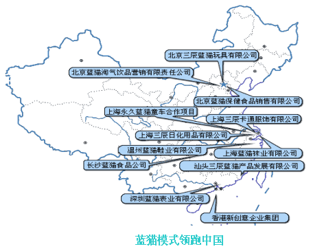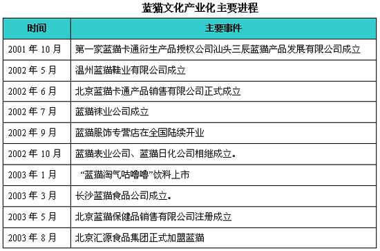 蓝猫的东家——三辰卡通企业集团的发展先后经历了创业起步阶段、品牌打造和品牌经营三个阶段。三辰卡通企业集团于2001年决定依托蓝猫品牌开始文化产业延伸,涉足儿童消费品领域。蓝猫在短短的3年内,就实现了由中国卡通第一品牌向中国儿童消费品名牌的飞速转变。蓝猫已经涉及食品、服饰、玩具、日化、图书等十几个儿童消费品领域。2003年蓝猫产业群销售收入达7.5亿元,预计2004年将超过20亿元,创汇2000万美元。由于蓝猫的快速发展,国家工商总局于2004年授于蓝猫为“中国驰名商标”。
