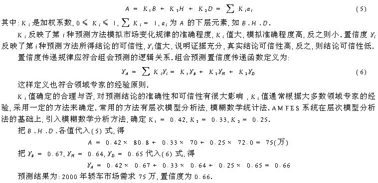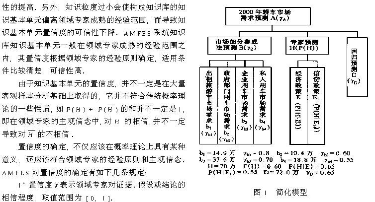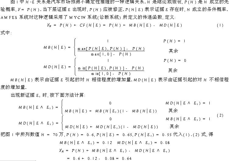置信度传递问题是建立专家系统知识库和推理器的基本问题之一。理论工作者提出了几种理论,如A·Dempter和G·Shafer的“belief theory”(信度理论),L·A·Zadeh的“Possibility theory”(可能性理论),都不够完善,还没达到应用的水平。汽车市场预测专家系统(AMFES)根据领域专家的知识经验,运用知识结构化分析方法,研究在预测这个特定领域不确定性推理的内在逻辑关系以及置信度传递规律,这对专家系统的理论发展具有重要意义。