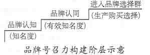 这十分容易使企业广告目标产生重大偏差,从而广告费用浪费严重。品牌知名度仅仅是衡量品牌号召力的一个指标,构建品牌力需要从多个方面入手。对于消费者而言,品牌知名度只能在特定的环境和条件下主导其购买行为。而仅就知名度研究,也是要相当细心的,与消费者购买行为更密切的并不是简单的认知知名度,起码是能够认同的有效知名度。如果一个品牌达到一定的认知知名度,继续以此为广告目标,损失效率是自然的。一个新品牌入市,初始面对消费者时,其知名度与购买率有一定的正相关性,但依据产品类别、同类品牌竞争状况不同而差异巨大。因而在一个品牌成长与维护过程中,广告的责任也是有所侧重的。一般而言,用品牌的号召力影响消费行为要经过以下心理阶层: