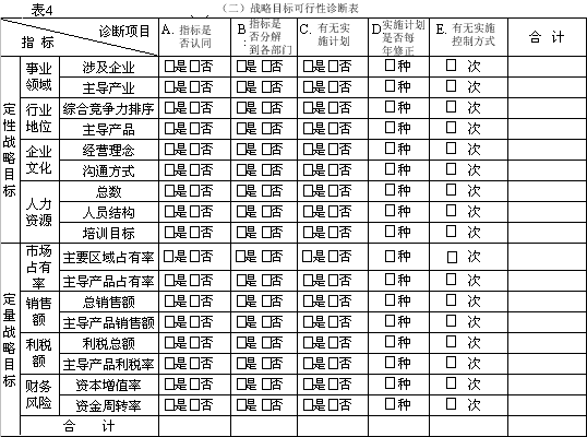 对战略目标的诊断,关键在于对战略目标的明确性、可行性的评价与判断。梅高公司凭借多年客户服务的经验和专业上的孜孜探求,毫不犹豫地把以往那些过于理性、滞后,难于操作、执行且形同检讨、总结的战略目标诊断方法统统扫进了历史的垃圾筐,继而推出一种务实、简单且易操作之诊断方法。方法介绍如下(见表l):