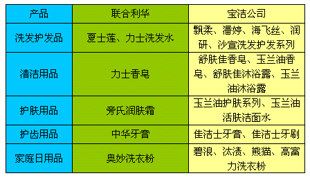 中国市场既广阔又复杂,由于地域、文化、习俗的不同,需求也有所差别,因而要更好地满足市场需求,就必须研究开发不同品种的产品。但联合利华在这方面无疑是欠缺的。下面是联合利华与宝洁公司产品的对照表,两者的区别大家一看便知。