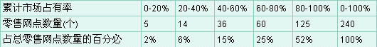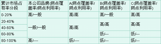 两年前主管营销的副总经理在年度初营销大会上动员并指示:每个办事处必须将开拓300个零售网点作为淡季网络建设工作的一项重要任务之一,并纳入淡季业绩考核。 大约3、4个月后公司又召开了一场重要的会议,这位领导非常生气:今年淡季回款很不理想;“开拓300个零售网点”的任务没有完成,从你们报回来的档案看,有的分公司仅开拓了100多个网点,有的分公司所列的网点几个月以来从来没有打款,也没有提货,这也算一个网点吗?而你们居然拿着这些名单来向我要资源建设卖场! 后来公司没有再强调“开拓300个零售网点”的口号,但还是鼓励多开零售网点,“以数量弥补质量”。 这些并不代表公司不重视营销管理。公司对渠道的考察工作一直没有间断,曾经派出二十多人庞大的队伍,对各地市场进行为期半个多月的渠道考察,并收集了几麻袋的数据资料,也许是数据不够真实或者没有对信息进行有效的分析总结,始终没有提供足够的数据支持渠道管理决策。后来公司总部成立了专门的部门科室进行市场管理,并制订了规范的信息制度(包括渠道动态档案、零售推广等),但是由于分公司的不配合以及总部部门之间的矛盾,最终这些制度并没有发挥作用,重要的市场一线的信息仅仅掌握在分公司直接销售人以及主管销售部长的脑袋里,总部无法对市场信息进行科学总结分析提供决策依据以及建议,因此就出现了上述的拍脑袋说话的情况。 这一年7月份,公司聘请了顾问公司进行指导,开展了一次全面的渠道研究工作。研究结果对零售网点得出了几个关键指标“网点覆盖率”、“网点利用率”、“网点改进潜力”。下面是某省部分代表性市场的研究资料,该省市场容量在全国各省中占中等水平(此数据在真实资料的基础上进行了一定处理): 表一:总体市场零售网点实力排列图