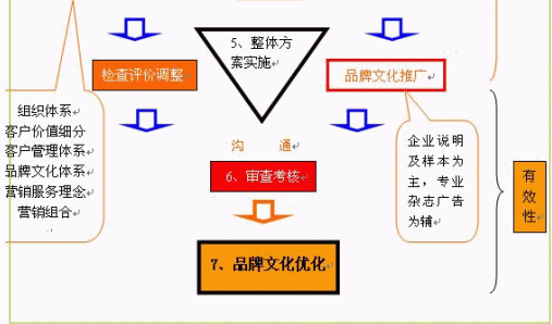 第三步是建立品牌文化体系 由于对不同的客户以及同一客户的不同产品会有不同定位的品牌文化,因此要明确本企业品牌内涵及其价值对客户的承诺、品牌附加值等因素,以及明确客户的特定产品的品牌内涵及其价值,对终端消费者的承诺、品牌附加值等。一般的品牌文化定位要考虑以下几个因素: 确定品牌文化范围 确定品牌文化个性 确定品牌文化价值 确定客户群体 确定客户价值 评估、提升客户关系 第四步是建立品牌文化管理体系 品牌文化管理体系包括了品牌内部管理体系和外部文化管理两个体系。 品牌文化内部管理体系指的是如何针对品牌文化的定位,在公司的内部全体成员从认识上进行高度一致的协同,通过各种管理的行为,包括现场管理、服务意识、营销体系等全过程进行品牌协同,也就是我们所说的身心一致。 品牌文化外部管理体系是通过各种媒体或载体,围绕品牌文化核心进行传播,但品牌文化的传播与传播品牌传播的着重点不一样,它主要的传播方式不是广告这样的硬性载体,而是借助各种宣传媒体进行长期的潜在渗透,也就是我们所说的软文,这种软文的主要着眼点在于建立一种氛围,让顾客潜移默化得接受了这种文化的感染,直接地说就是洗脑式传播(Brainwash Communication),可能这名词听起来不是很好听,但它传达的意义在文化是必需多次反复、而且要潜在无意识地传播,才可能形成,润物细无声是这种传播的高级境界。 第五步是方案的实施 第六步是审查考核 一种品牌文化的建立不是一蹴而就的,需要较长时间的建立,在这段时间内,企业品牌负责人要对品牌文化的实施进行全面的监控,在品牌文化定位的基础上防止品牌文化的变异,在各种载体上对品牌文化做全方位较验,必要的市场调研是品牌文化形成的基础,完善的品牌监控体系是品牌经迅速形成的制度保障。当然,在信息化时代,借助互联网力量,形成一种新的品牌文化的周期已经可以大大缩短,因此对于品牌文化的监控也增加了难度。 第七步是品牌文化的优化 品牌文化的优化是指在品牌文化的形成过程中,企业根据市场和顾客的需要,不断检验品牌文化的定位和延伸,在此基础上进行品牌文化的创新或整合的过程。例如要创新品牌文化的内涵,可以以一种品牌文化资源为突破口,带动其他品牌文化资源的丰富和发展,如以大客户效应组合推广企业品牌文化;围绕技术领先提升企业品牌文化;以知名品牌组建企业,等等。同时我们要注意一些操作规范,比如为控制品牌文化管理幅度,就要不断精确品牌半径,清洗品牌文化间隙,避免品牌文化浸润。和客户保持良好的沟通,提高理解能力和品牌文化融入性。根据品牌现有和未来的市场占有率、盈利能力指标对品牌文化分类管理: 市场占有率、盈利能力均较低的品牌,应退出或转让掉; 市场占率、盈利能力均较高的品牌,应加大投资力度、重点优化; 市场占有率高、盈利能力低的品牌,属老化,应重新建立品牌文化; 市场占有率低、盈利能力高的品牌,有潜力,应加大投资和提升品牌文化的推广力度。 经过这七步之后,一个品牌的文化内涵就基本建立起来,这只是万里长征的第一步,至于一个品牌文化最终成功的经历,不同品牌有不同的定义,但无论是多少步,这第七步是肯定要踏出去的第一步。 总之,品牌的建立不仅仅要知名度、美誉度和忠诚度更加要讲究信仰度,顾客对于品牌的忠诚最终还是取决于他们对品牌内涵的理解和认识,这种内涵只是通过一些传播语或所谓的差异化营销方式是不可能持久的。正如一个人可以通过广告认识一个品牌然后去消费它,但你却无法保证他以后在没有任何外部诱惑的背景下去消费你的产品,更加无法确认他是否可以自觉得去维护他心目中品牌的形象,这一切基因为他没有对品牌形成一种信仰。认识品牌、接受品牌、忠诚品牌到信仰品牌,这个过程并不是所有的品牌都可能经过的阶段,往往在忠诚品牌的时候已经就出现断裂,而品牌信仰的伟大在于它不仅仅是忠诚者自己去消费品牌,而且他们自觉地去维护品牌,去帮助品牌拓展他们的忠实用户。就象宗教一样,教徒不仅自己毕生信仰一个教派,而且他们还会主动去传播教派教义。而这些都要求品牌有一种强大的文化支撑,所以品牌文化是实现品牌信仰的惟一途径。