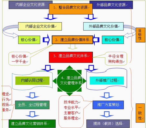 创建品牌文化七大流程 经盛创建品牌文化流程图 如何创建一个强大的品牌文化,是每一个品牌战略的核心使命,尽管不是所有最终拥有强大品牌文化的建设都是从一开始就有意识去按照这样的一个流程去铸造品牌文化,但无疑他们在实施过程中基本都是根据这种流程操作,因此最后的结果是使品牌穿上了文化的嫁衣而焕发新生。根据我们的经验,创建品牌文化的流程一般有以下七大步骤。 第一步,整合品牌文化资源 建立品牌文化的第一步是确认可以使用的各种文化资源,包括内外部的各种文化资源,根据品牌定位筛选与品牌定位相关的各文化因素。 外部文化资源主要是指品牌本身一些资源,如: 企业名称(字号) 这是企业无形资产中商誉的主要载体。企业字号有的是历尽百年沧桑的老字号,有的是近年脱颖而出的新字号,有的企业有好几个知名老字号。 企业CIS系统 这是指导入企业的所谓“企业形象识别系统”,主要通过企业图案标识体现,一般一个企业只有一套CIS。 商标 经注册或未注册的在商品上的标识,企业可能有多个注册商标。 商品名称 企业生产的对商标的称呼,可与商标一致或不一致。 名人 企业家或职工杰出代表在社会知名度极大,也可作为企业一种品牌资源。 内部企业文化资源,是指可以反映并影响品牌定位的各种文化因素,它的基础是企业文化,根据我们的企业文化基石模型,企业文化是基于以下各种文化因素形成的: 世界文化 民族文化 地方文化 行业文化 职业文化 在企业文化因素的整合下得出与品牌文化不一致的企业文化的要素,确保内外部文化的一致性。 第二步,建立品牌价值体系 在收集和整合内外部的各种文化资源之后,根据品牌战略定位,对各种文化因素进行提炼,确定品牌的价值体系,如香港李锦记集团的品牌文化定位是“传播中华民族优秀的饮食文化”,它的品牌价值是“一流的品质,正宗的口味”,那么它延伸出来的产品文化体系就可以在企业品牌文化价值体系基础上进行延伸,使顾客对公司的品牌都产生一个凡是李锦记集团的产品都是一流的饮食产品的品牌印象,进一步延伸出中华优秀饮食的健康文化传统出来,而李锦记就是这种文化的典型代表。这种文化价值体系也是企业内部的文化价值体系所要倡导的,如李锦记集团的企业文化体系就应该是让每一个员工都清晰知道他们工作的价值就是为中华民族的优秀饮食文化而努力,这才可以使得内外部的文化价值能够高度一致。 对于内部价值体系如何建立,我们可以举联邦快递公司价值体系排序的例子。它是用雷诺兹和古特曼研发的排名法来确定品牌核心价值:先确定品牌最重要的特征,然后要知道重要的品牌特征 “它为什么是重要的?”理由被记录下来,并且“它为什么是重要的?”这一问题再次被问及,以求获得新的理由,重复这一过程直到被调查者给出了一种价值观为止。然后选出第二重要的品牌的特征,重复上述过程,对于剩下的那些特征也同样得出。