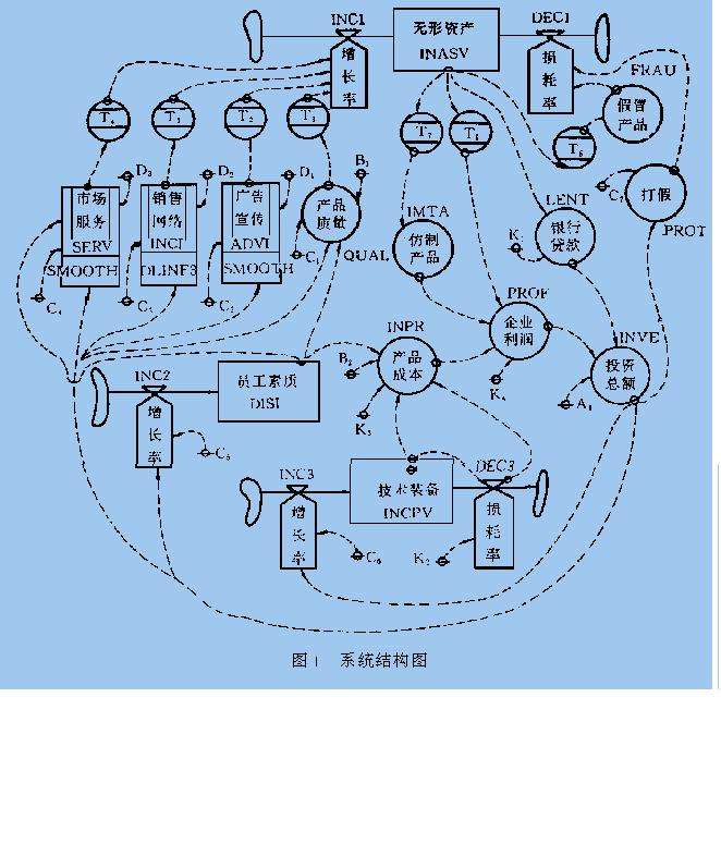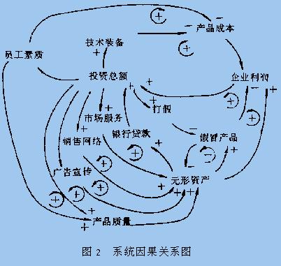 1.2 系统结构的反馈机制 系统行为根植于系统结构.从图1可清楚地看到结构流图中包含着错综复杂的变量交互作用、正负反馈机制的耦合效应. 从因果关系图(图2)可看到,无形资产的形成与增值,是多重复杂反馈机制的直接耦合和间接耦合的综合效应.其中直接耦合效应应包括产品质量、广告宣传、销售网络和市场服务的四重得到加强的利润正反馈机制的交互.