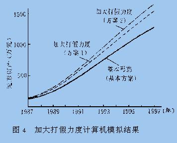 2. 名牌战略创造无形资产的运作内涵 名牌战略创造无形资产的运作机制,系指实施名牌战略中创立名牌、宣传名牌、保护名牌和发展名牌的功能释放方式,以及它们之间的联动、促动的交互关系.我们把创立名牌、宣传名牌、保护名牌和发展名牌称作为名牌战略创造无形资产的基本运作要素. 2.1 创立名牌 一般来说,名牌不可能随着企业的组建、产品的生产而与生俱有,而是要经过企业一代人甚至几代人苦心经营才能建立.要实施名牌战略首先要创立名牌.名牌的创立一般包括以下几方面:(1)树立名牌意识:员工的名牌意识是创立名牌的前提;(2)保证产品质量:企业的产品质量是创立名牌的基础;(3)进行市场定位:准确的市场定位是创立名牌的关键;(4)实施品牌决策:细致的品牌决策是创立名牌的内涵;(5)设计个性化商标:创新的商标设计是创立名牌的起点. 在系统结构图中,创立名牌的运作更多是体现在产品质量、员工素质和技术装备的正反馈机制之中,也体现在销售网络和市场服务的正反馈机制中. 2.2 宣传名牌 所谓名牌,就是在很大范围内知名度极高的品牌.一个商标的“含金量”不仅需要过硬的产品质量来支撑,更需要出资进行宣传以提高其知名度.通过大量反复的广告宣传,以不断加深消费者的印象,占据他们的心灵,培养品牌忠诚者.在系统结构中宣传名牌的运作主要体现在广告宣传正反馈机制之中,也渗透在市场服务和销售网络的正反馈机制之中. 2.3 保护名牌 由于名牌商品在市场上的卓越表现及其所带来的超额利润,必然会引起不法之徒为追求高额利润而非法假冒.非法假冒的产品使得拥有名牌的企业在各方面受到了损害,因此保护名牌在名牌战略中起着越来越显著的作用.常见的保护措施有:法律保护、技术保护和通过增强企业竞争力而促使品牌竞争力得到加强的自我保护,另外培养品牌忠诚者也是保护名牌的一种有效方法.在系统结构图中,保护名牌的运作主要体现在打假的正反馈和假冒产品的负反馈机制之中,另外也渗透在市场服务和销售网络的正反馈机制之中. 2.4 发展名牌 任何事物的发展都是不进则退,名牌也不例外.名牌的价值是在市场中形成的,不是在竞争中保值增值,就是在竞争中衰退消失.因此如何发展名牌对于一个实施名牌战略的企业来说是一个深层次的问题.现在普遍的名牌发展方法主要有:利用已出名的品牌推出新产品或改良品的品牌拓展方法;增强企业竞争力的技术创新方法;提高市场占有率的规模经营方法等.在系统结构中,发展名牌的运作主要体现在销售网络、市场服务和产品质量的正反馈机制中,同时也体现在广告宣传的正反馈机制中. 3. 策略分析 凭藉系统结构模型,运用计算机模拟技术进行策略分析,以揭示名牌战略创造无形资产的规律性. 3.1 模拟方案设计 我们设计了典型企业实际状态的基础方案,同时设计了多个策略分析方案:如加大打假力度,提高产品质量和品位,提高员工素质等.