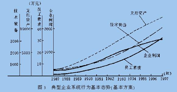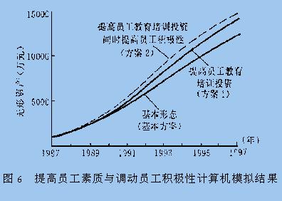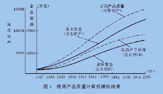 3.2 结果分析 图3是表达企业实际状态基本方案的计算机模拟结果,其中4条形态曲线是企业名牌战略创造无形资产的系统行为基本态势.从图中可看出各项指数逐年增长,表明了企业实施名牌战略多年来所形成的活力和后劲,也展示着企业发展的美好前景.从无形资产形态曲线中可看出1993年其增长率开始下降,这是由于假冒产品的猖獗使企业利润增长受阻而导致的. 改革措施就是加大打假力度,增大打假投资强度.图4所示计算机模拟结果为加大打假力度后的无形资产形态曲线,其中方案1投资强度是基本方案的6倍,方案2投资强度是基本方案的8倍.从图中可得出改进方案的无形资产形态曲线有所改善,但不显著.原因是多方面的,主要是由于法制不健全,商业道德不规范,地方保护主义等种种因素,致使采取很大的打假努力,也难取得明显效果. 图5所示为提高产品质量和品位的计算机模拟运算方案,其中产品质量投资强度从占投资总额的7%增加到28%.从结果中可看到无形资产的总量和企业利润都得到了相应增加. 图6为提高员工素质和调动员工积极性的计算机模拟结果.其中方案1将员工教育培训投资由0.3%增加到3%;方案2是员工教育培训投资由0.3%增加到3%,同时员工积极性提高1倍.从图中可明显地看到方案1提高员工教育培训投资要优于基本方案,方案2提高员工教育培训投资同时又提高员工积极性,则效果更佳. 4. 结 论 (1)本文通过对名牌战略创造无形资产运作的系统动力学模型的研究,有效地揭示了名牌战略创造无形资产的运作内涵,并具体地剖析了典型企业的运作策略. (2)本文通过多个策略方案的分析和计算机模拟结果的分析,提出了典型企业的名牌战略创造无形资产的当前运作特点:即根据计算机模拟结果调整运作过程中的侧重点,从而使企业策略运作更有效. 上海大学学报(自然科学版) 王振江 朱大弟 |