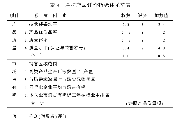在对名牌产品的定义、名牌产品的特征进行了较为详尽的界定和阐释,并对如何评价名牌产品给出了相应的指标评价体系 2 . 4 领先的赢利水平 名牌产品通过不断扩张来提高自己的市场份额 ,从而使企业达到一定经济规模 ,获取客 观的经济利益 ,在成长中不断进行技术创新 ,产品升级换代 ,增加名牌产品的科技含量与附加 值 ,形成产品更高利润率 ,从而使赢利水平大大超出同行业平均利润水平。 美国比尔 .盖茨微软公司后来居上 ,其知名度超出“苹果”、“康柏”等名牌 ,即因为它的销售 利润水平远远高出同行业的平均水平。1 994年世界高技术行业的平均利润水平不足 1 0 %,“微 软”却高达 37%。正是这样的赢利水平支持了它的快速发展 ,使盖茨成为排名世界的首富 ,也 使“微软”品牌名扬天下 ,享誉世界。 3 名牌产品应具备的基本条件 名牌产品从质量、效益上表现出了四个方面的特征 ,但作为一个名牌产品还必须具备以 下基本条件。 3. 1产品质量在国内同类产品中处于领先地位 ,并达到国际同类产品的先进水平 ,产品已获 国家产品质量奖。 3. 2产品适应市场需求 ,具有高知名度 ,高市场占有率 ,企业生产能力达到经济规模 ,年销售 额经济效益居本行业领先水平 ,并连续保持 5年以上。 3. 3企业质量体系健全并有效运行。 3. 4企业具有先进可靠的生产技术条件和技术装备 ,有很强的产品开发能力。 3. 5市场评价好 ,售后服务体系健全 ,消费者 (用户 )满意。 3. 6近 3年 ,国家、行业主管部门及省一级产品质量监督抽查中质量合格 ,出口产品无退货、索 赔等质量事故。 4 名牌产品的评价 4. 1评价原则 明确了名牌产品的含义与特征 ,还要确定评价产品是否名牌的一些原则 ,根据这些原则 建立名牌产品的评价指标体系。这些原则至少应包括以下内容。 4. 1 . 1科学性原则。这是建立评价名牌产品指标体系的主要原则。 评价一个产品能否成为 “名牌” ,其评定工作要依据科学的理论、实践 ,并坚持公正、公开、公平的三公原则 ,即做到指 标体系科学公正 ,评选条件公开 ,评定公平 ,决不主观臆断 ,断章取义 ,以偏概全 ,搞平均主义 , 搞不正之风。 4. 1 . 2自主性原则。在评定过程中 ,一定要尊重企业的权力 ,坚持“自愿申报 ,自主决定”的宗 旨 ,而不能用行政的手段 ,对不具备条件的企业滥竽充数 ,拉郎配 ,对具备基本条件的企业也 应认真听取企业意见 ,尊重企业的选择。 4. 1 . 3动态性原则。对已评定为名牌的产品 ,要实施动态管理 ,不能“一劳永逸”、“终身制”。为 此 ,首先要保证评定指标体系在一定时期的相对稳定性、动态性。体系中的各项指标能够代表 3~ 5年甚至更长时期行业的先进水平 ,有一定发展性、国际性、超前性。同时 ,也要考虑科学 发展 ,技术进步 ,观念创新等因素 ,适时的对指标加以调整。 另外 ,对评定的名牌产品的企业要坚持动态跟踪、考核、监督、调整。一旦失去原有水准 , 就及时警告 ,甚至调整出局 ,以确保名牌的权威性、严肃性和影响力。 4. 1 . 4数量化原则。我们依据名牌产品所具备的特征 ,来确立评价原则与指标体系 ,那么对特 征中包含的一些定性项目应尽可能的地量化成定量指标 ,加强指标的可比性、直观性和可操 作性。 4. 2评价指标体系 名牌产品所包含的四项基本特征是衡量产品能否成为名牌的唯一标准 ,在评定原则的基 础上把特征中的四大方面细化成若干要素 ,赋予相应的权数 ,进行综合评定。指标体系的基本 框架见表 5 表 5中对名牌产品特征的每一项目细分为若干影响因素 (包括名牌产品的基本条件 ),并 对各影响因素在本项目中所起的作用 ,赋予相应权数。采用 1 0分制 (或 1 0 0分制 ),运用专家评 定法 (或其他评分方法 ),对各因素进行打分 (可对各因素细化为高、中、低水平 ,或以行业标准 依据对比参照 ),将各因素加权分值累计为该项目总分。然后累计四个项目总分为该产品的总 得分。某产品总分 =∑(产品质量 +市场占有率 +信誉 +经济效益 )得分。产品总分达到或超 过该类产品名牌标准分 ,即可初步确立为名牌产品。 黑龙江八一农垦大学学报 孙勋成,童志龙 |