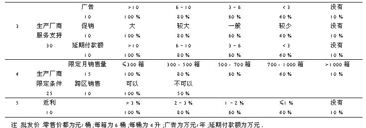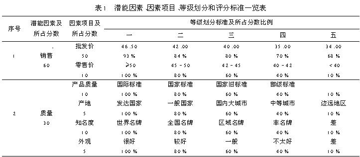 运用价值工程原理,分析了商业企业选择代理“品牌”要考虑的若干因素,提出了一种优化商业企业选择代理“品牌”种类的价值分析方法,并用实例进行了验证。 成本系数的确定与潜能系数的确定步骤方法相同,不再赘述。 表2是对江苏省市场上听装汽车润滑油销售情况进行分析后,确定的成本因素、因素项目、等级划分及其定量评分比例的标准情况一览表。(见表3) 下面对表1,表2进行说明: 1)潜能因素和成本因素及其因素项目按逻辑打分法得出各自分数,最低级为5分,每一级相差5分。在表1中潜能因素及因素项目的级别顺序为:产地、外观(各5分);零售价、产品质量、知名度、广告、促销、延期付款额、返利、跨区销售(各10分);限定月销售量(15分);批发价(50分);合计为155分。在表2中成本因素及因素项目的级别顺序为:销售服务人员费用、场所费用(各10分);进价(50分);合计为70分。应说明的是,对不同类型的代理“品牌”,同一类型商品的不同寿命周期阶段,因素、因素项目有所不同,各自逻辑评分也有差异。表1、表2是针对1996年期间江苏省汽车听装润滑油市场的具体情况而得出的。若情况不同,应作相应的调整。 2)考虑到江苏汽车听装润滑油市场价格差异在5~10倍之间。因此,等级划分标准及比例的确定原则上在100%~10%之间比较合理。 3)商业企业的获利主要来自于进销差价,因而给批发价和进货价分数最高且相等,均是50分。为了使进货价和批发价的等级划分及其所占百分比更准确,等级划分标准就是各自的批发价和进货价,从大到小排列。批发价所占分数比例按各自的批发价与该因素项目分数50之比来确定;进货价所占分数比例按各自的进货价与该因素项目分数50之比来确定。 4)产品质量均指符合国家有关标准规定的合格产品。 5)延期付款额是指生产厂商为了减轻代理商的资金压力和风险,供给第一批货时,代理商只需付部分货款;供第二批货时,代理商付清第一批剩余货款,同时再付第二批部分货款,以此类推。按合同规定暂时少付的那部分货款就是延期付款额。 6)限定月销售量是指商业企业每月必须达到的最低销售量,达不到则失去代理商资格,投资项目失败。 7)返利是指生产厂商为了鼓励代理商销售,稳定市场价格,保证代理商获利,在代理商完成每月销售量后,生产厂商每季或每年按比例返给代理商的资金或商品。 8)进货价已包含运费和卸货费。 9)场所费用包括:经营办公用房、仓库、装璜的费用。 4.实例分析 笔者曾对江苏省某汽车用品公司进行过实例分析。该公司在1996年成立初期,通过调查江苏省汽车听装润滑油市场和相关的生产厂商情况,采用VE方法,从处在产品寿命成长期的美孚、太阳、统一、海牌、大桥五个品牌中选择一个作为公司的主营代理“品牌”。 每种品牌的润滑油均有SC、SD、SE、SF、SG、CC、CD级别的产品,通过调查发现,SE级润滑油市场用量特别大,约占总需要量的50%以上。五个生产厂商SE级听装汽车润滑油占其相应的总销量分别为:美孚65%、太阳70%、统一52%、海牌45%、大桥43%。因此,以SE级听装汽车润滑油作为它们的代表来评判比较合理。A、B、C、D、E分别表示美孚、太阳、统一、海牌、大桥的品牌。按表1和表2划分标准、得分比例得到各品牌的潜能因素、成本因素得分分布情况。(见表4)(见表5) 潜能系数、成本系数和投资价值系数。(见表6) 从实例分析中可得出以下结论: 1)统一牌投资价值系数远高于1,即投资价值最高,且远高于其它四个品牌。该汽车用品公司选定统一牌作为主营代理“品牌”后,当年销售情况很好,人均获净利2.1万元,1997年销售量和人均利润又都增加了一倍。 2)大桥牌投资价值系数远小于1,投资价值比较差。事实上,江苏省各个地区的商业企业都不愿做其代理商,该厂家只好直接销售,到1997年底,该厂听装汽车润滑油在市场上几乎销声匿迹了。 3)美孚、海牌、太阳牌投资价值系数近似于1,均具有一定的投资价值。虽然美孚牌价格最高,海牌、太阳牌要求销售量最大,代理商销售有一定的难度,但它们均有“质量”、“生产厂商服务支持”的优势,且海牌还有“跨区销售”的优越条件,只要代理商实力雄厚,营销措施得当,都是可以作为投资项目的。某石油总公司润滑油公司选择海牌为主营代理“品牌”,充分利用跨地区销售的优势,积极开拓市场,1998年6月底,已成为江苏省海牌润滑油总代理商,取得了可观的经济效益。某轿车商行选择美孚牌为主营代理“品牌”,经营中扬长避短,1998年销售量和获利在江苏省十五个地区代理商中居第五位。某汽配公司选择太阳牌为主营代理“品牌”,由于未使用好“生产厂商的服务支持”,销售服务等人员费用居高不下,1997年下半年开始,销售量和利润大滑坡,1998年7月底,丧失了太阳牌润滑油地区代理商资格,整个企业面临窘境。 4)上述这些实例,证明了犞犈在商业企业选择代理“品牌”中应用的可行性,说明表1、表2中汽车听装润滑油“品牌”的潜能因素和成本因素、因素项目所占分数比例及等级划分标准具有一定的合理性。 5.需要进一步探讨的问题 通过实例分析,本文介绍的方法对代理“品牌”进行选择具有一定的可行性和准确性,但仍有进一步探讨的必要。 1)用投资价值系数的高低进行“品牌”选择,只能确定投资选择的顺序、优先级,不能完全判断出某个代理“品牌”是否值得投