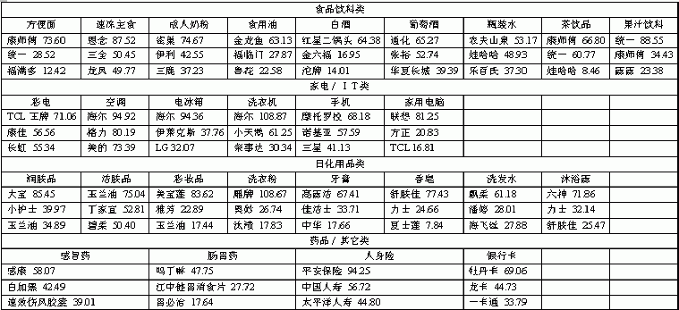 在食品/饮料领域,本土品牌和洋品牌平分秋色。可口可乐、雀巢,康师傅和统一等外资、台资品牌在碳酸饮料、奶粉、方便面、茶饮品和果汁饮料上的优势地位十分明显。而国产品牌则在白酒、葡萄酒、瓶装水、食用油、速冻主食等市场上表现突出。