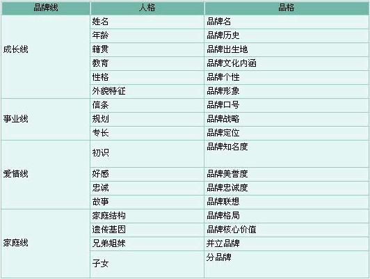 了解品牌的最好方法是把品牌当人看。 品牌的诞生犹如初生的婴儿,每一步都需要你的精心呵护、引导以及爱的浇灌,才能不断茁壮成长。幼小的生命是脆弱的,你必须尽责监护,否则,品牌将夭折在初生的摇篮。 等他长大一点,他上学了,从小学到中学再到大学,受到良好的教育,不断提高自己的文化内涵,慢慢地有了自己的性格、追求和理念,以及对人生的规划。 他走上了社会,在大浪淘沙的市场洗礼中,懂得了如何运用自己的专长去形成自己的竞争优势,以赢得喜爱、尊重和事业的长足进步。 这时,生命中的另一半开始向他走来。经历了慕名相识、相互了解、彼此喜欢、直至两心相许,一起走向红地毯。 他们忠诚的相爱,组建了一个美好的家庭,生儿育女,儿又生子,子又生儿,形成了一个蔚为壮观的品牌大家族。有一天,他们去了另一个世界,但我们相信他们没有死去,因为他们的生命通过基因正世代相传,生生不息。