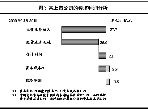 一、什么才是真正的利润 很多公司的销售和资产规模不断扩张,会计利润也在不断增加,他们通过会计报表谱写了一个个“脱贫致富”的动听故事。然而,在会计利润的数字背后,这些公司是否真的提高了营运效率、创造出了真正的财富呢? 会计利润的计量方法以利息费用的形式反映债务融资成本,但它却忽略了股权资本的成本。在会计报表上,出资者的股权资本投入对公司来说是无成本的。如果考虑了股权资本成本,结果将会怎样呢?通过下图某上市公司的实例,可以发现看似可圈可点的会计利润,在考虑了股权资本成本的情况下,却是在毁灭财富。