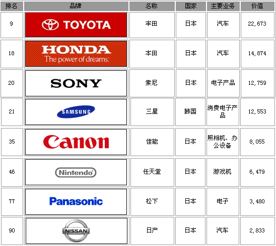 最新出版的美国《商业周刊》杂志公布了2004年度“世界100个顶级品牌排名(The 100 Top Brands)”,亚洲上榜品牌中日本占了七位,韩国占了一位。