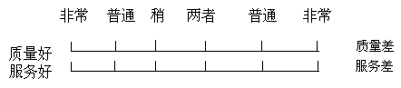 A品牌大多数人熟悉并喜爱;B品牌大多数人不熟悉,但熟悉的人都喜爱;C品牌熟悉的人都持否定态度,好在熟悉的人不多;D品牌情况很不好。 由此可见,它们面临不同的任务:A品牌要维持现有的知名度和喜爱度;B品牌要争取更多人的注意;C品牌要了解消费者对它持否定态度的原因,并努力改进;D品牌面临的困难很大,要改进的地方很多。 三.确定品牌形象内涵 也就是确定消费者对品牌的确切看法,找出喜爱或不喜爱的真正原因。常用的方法是语意差别法,语意差别法就是在两个意义相反的词之间列上尺度,由被调查者选择代表他或她意愿方向或程度的某一点。 调查消费者购买产品时考虑的主要因素,如询问“你购买彩电时,最关心的是什么”,回答“质量”,那么按此划分为两个尺度:产品质量好和产品质量差;回答“服务”,那么按此划分为:服务质量好和服务质量差;等等,再在划分的两极之间分出五或七个尺度,以此作为评价标准。一般说来,有三种类型的尺度:评价尺度(好---坏)、能力尺度(强---弱)、行为尺度(主动---被动),根据这三种标准,可以去掉没有意义且引起被调查者厌烦的尺度,以此作为品牌形象评价的项目。调查用的问卷做法如图: