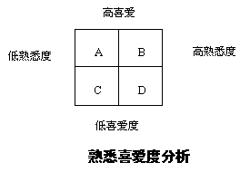 知名度测试就是确认消费者对品牌的熟悉程度。测定可按照以下尺度: 从没听说过 仅听说过知道一点 知道很多 很熟悉 判断标准:回答限于前两项,品牌当前任务是建立知名度 二.测定品牌喜爱度 如果消费者熟悉这一品牌,接下来要判定消费者对品牌喜爱程度。测定可按下列尺度: 很不喜爱 不怎么喜爱 无意见 比较喜爱 很喜爱 判断标准:回答选择前3项,那么企业要弄清消费者不喜欢的原因。 例如调查A、B、C、D四个家电品牌消费者对他们的熟悉程度和喜爱程度,经平均计算,结果如下: