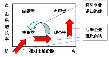 市场的竞争使得一些强大的竞争者有着最好的生存条件,它们早已经树立了自己的优势:品牌、服务、渠道……可是作为新来的企业,该靠什么生存?也就是说,在能力还没有形成的时候,用什么方式与对手周旋,争取生存下来,然后不断积累实力,加强自身的地位? 作为一个市场的后来,要打破这种竞争的格局才能够扭转不利的局面。但是这谈何容易,新进入市场的企业实力不如人、能力也不如人,对抗当中并不占优势。要想取得市场的突破,只能选择从边缘切入,要做大,就要敢于从“瘦狗”业务开始。 企业要获得最多的利润,就要进入主流产品市场。但正是这样的市场,竞争十分激烈,在这样的市场上,新进入的企业很难具备竞争实力。因此避开主流,在一些边缘产品市场寻求突破是一条可取的道路。 我们都知道,在著名的波士顿矩阵中,一个经营多种业务的企业可以按照市场增长率和企业的市场占有率将自己的业务分为四类:瘦狗类、问题类、明星类和现金牛类。 问题业务是指高市场成长率、低相对市场份额的业务。这往往是一个公司的新业务,为发展问题业务,公司必须建立工厂,增加设备和人员,以便跟上迅速发展的市场,并超过竞争对手,这些意味着大量的资金投入。“问题”非常贴切地描述了公司对待这类业务的态度,因为这时公司必须慎重回答“是否继续投资,发展该业务?”这个问题。只有那些符合企业发展长远目标、企业具有资源优势、能够增强企业核心竞争能力的业务才能得到肯定的口答。 明星业务是指高市场成长率、高相对市场份额的业务,这是由问题业务继续投资发展起来的,可以视为高速成长市场中的领导者,它将成为公司未来的现金牛业务。但这并不意味着明星业务一定可以给企业带来滚滚财源,因为市场还在高速成长,企业必须继续投资,以保持与市场同步增长,并击退竞争对手。企业没有明星业务,就失去了希望,但群星闪烁也可能会耀花了企业高层管理者的眼睛,导致做出错误的决策。这时必须具备识别行星和恒星的能力,将企业有限的资源投入在能够发展成为现金牛的恒星上。 现金牛业务指低市场成长率、高相对市场份额的业务,这是成熟市场中的领导者,它是企业现金的来源。由于市场已经成熟,企业不必大量投资来扩展市场规模,同时作为市场中的领导者,该业务享有规模经济和高边际利润的优势,因而给企业带大量财源。企业往往用现金牛业务来支付帐款并支持其他三种需大量现金的业务。 瘦狗业务是指低市场成长率、低相对市场份额的业务。一般情况下,这类业务常常是微利甚至是亏损的。瘦狗业务存在的原因更多是由于感情上的因素,虽然一直微利经营,但象人对养了多年的狗一样恋恋不舍而不忍放弃。 但实际上波士顿矩阵是相对于企业来说的,各企业的生产成本不一样,也许对一个企业来说的一项瘦狗业务,可以成为另一个企业的现金牛;一个企业希望放弃的业务,可能成为另一个企业发展的机会。竞争中的强势企业会因为瘦狗业务通常要占用很多资源,如资金、管理部门的时间等,多数时候是得不偿失而采取放弃的态度。这时作为