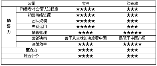 数字 如果单纯看全球或中国的销售额,欧莱雅都绝对处于下风,以此判断两公司的竞争态势,显然太片面。毕竟,欧莱雅目前还是全球化妆品老大,欧莱雅在中国的7年,发展迅猛,具体情况见下表。数字能从一个方面说明问题:在年增长只有5%的大众消费品市场,欧莱雅2003年的销售业绩在上一年的基础上猛增69.3%,市场占有排名从第6升级到第3,整体业绩比刚刚进入中国时的1997年增长824%,刚刚结束的2004年度增幅达到85%,市场排名达到第二。 对于两强来讲,竞争已经不是产品的品质、品牌、文化、人才、战略,而是销售力、整合力的深度竞争。但是在销售力和整合力上,宝洁略占上风,具体表现在: