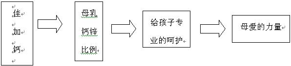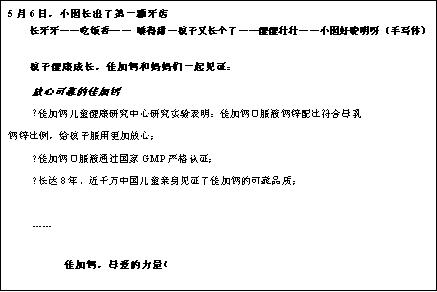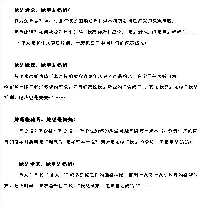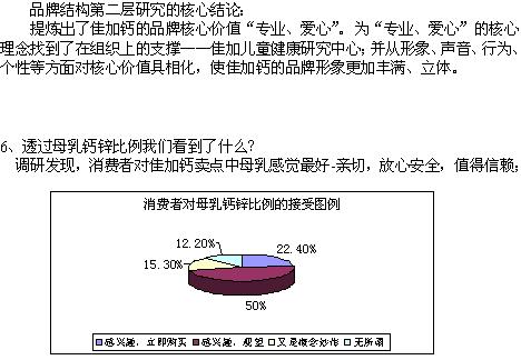 消费者调研均对母乳钙锌比例的特点表现出了莫大的兴趣。 母乳是母亲给孩子的第一份力量!是母亲对孩子深深的关爱;佳加钙为孩子所做的一切工作,不正象母亲一样,要给孩子一份更高的力量吗--让孩子更健康,更坚强,更优秀! 力量来自于佳加钙给孩子补充钙锌,让孩子健康成长。 力量来自于执著于品质的专业精神。 力量来自于如母亲般无私的拳拳爱心,让孩子成为明天的栋梁。 在佳加钙,我们称之为母爱的力量! 7、佳加钙品牌结构第三层的核心结论——佳加钙品牌写真