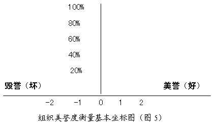 限定区域目标公众量标准分法,就是以在一定的区域内的同一行业中,交换物在社会(市场)上,以认知度最大的组织(常模)为标准(100%),用被测组织与之比较,确定相应的档次(A、B、C、D、E)。 3、美誉度 美誉度,就是组织获得公众赞美、称誉等正面评价的程度。我们用“组织(品牌)美誉度衡量基本坐标图”(图5)来量化。其结果分为5个档次(有的专业书籍划分为11个档次)。